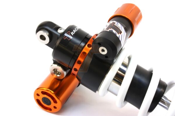 Le principal avantage d’un amortisseur avec réservoir externe est que l’amortisseur contient beaucoup plus d’huile et présente également beaucoup plus de surface de refroidissement qu’un amortisseur sans réservoir. Il offre en outre les capacités de réglage pour contrôler le débit d’huile de compression (entrant). Deux régleurs distincts contrôlent l’amortissement respectivement à basse vitesse d’amortisseur (ondulations lentes de la piste/route) et à haute vitesse d’amortisseur (chocs ou trous soudains). La tirelire fixe s’intègre parfaitement dans le cadre de la moto. L’amortisseur est équipé d’un système dit PDSII contre le creux. Il a un 2e piston d’amortissement monté au-dessus du piston d’amortissement principal. A la fin de la course entrante de l’amortisseur, ce 2ème piston amortisseur pénètre dans une coupelle et crée un niveau d’amortissement supplémentaire. Cela se produit uniquement pendant le mouvement entrant et uniquement à des vitesses entrantes élevées. C’est effectivement un coussin qui absorbe l’énergie entrante élevée et empêche un fond dur de l’amortisseur. Cela conduit à un confort et une sécurité accrus. Dans le même temps, les impacts de fond sur le cadre de la moto sont minimisés, ce qui entraîne moins de boulons pliés et de dommages.
