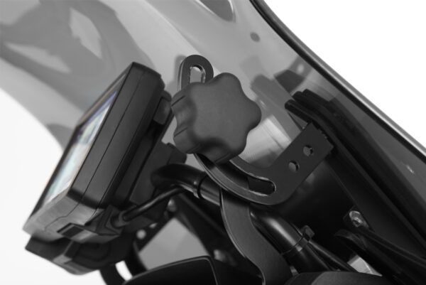 Le renfort de bulle à gauche stabilise la bulle de carénage et réduit ainsi les turbulences et vibrations dues au flux d’air à vitesses élevées Outre cela, le renfort de bulle à gauche veille à une fixation particulièrement sûre de la bulle de carénage lors de parcours en tout-terrain. Le renfort de bulle augmente en particulier le confort de conduite des bulles de carénage hautes.